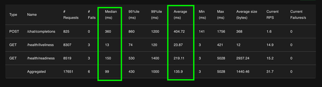 Expect to see the following response times for /health/readiness Median → /health/readiness is 150ms